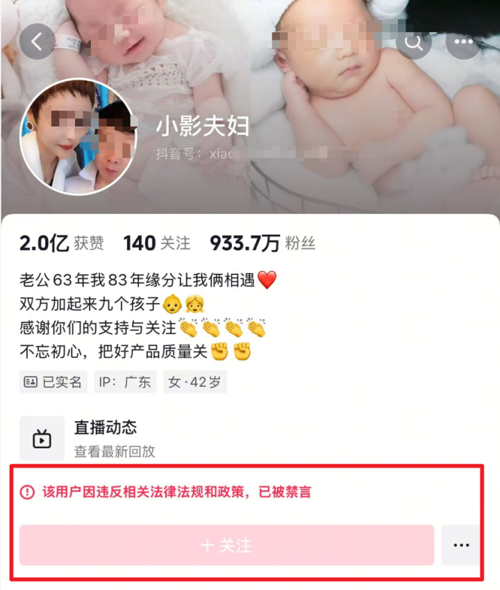 其账号已无法关注,页面显示“该用户因违反相关法律法规和政策,已被禁言”。