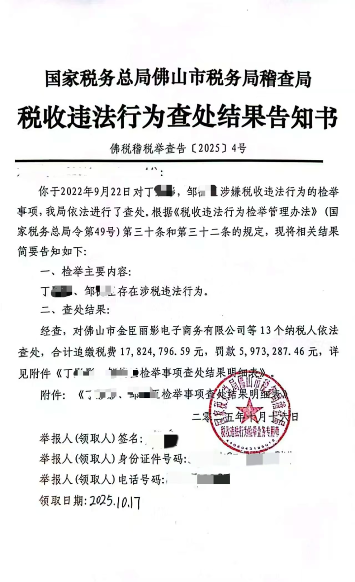 据华商报大风新闻此前报道,实名举报人樊女士称,她已拿到税务部门出具的查处结果告知书,900多万粉丝抖音网红小影夫妇,因偷逃税被广东佛山市税务局稽查局查处,合计追缴税费17824796.59元,罚款5973287.46元,合计金额高达2379万元。